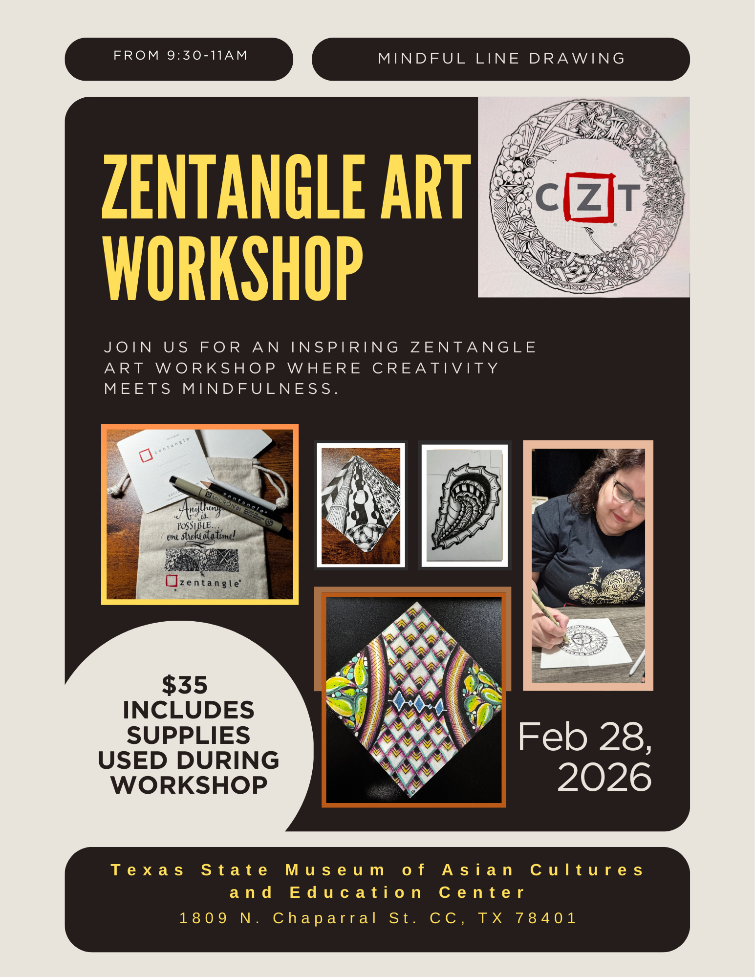Texas State Museum of Asian Cultures 1809 N. Chaparral Street, Corpus Christi, TX, United StatesIn this class you will learn how you make a Zentangle and artistic and mindfulness practices that come with it. Come learn a practice that you can take anywhere with you! Supplies included for the class. Take home supply kits available